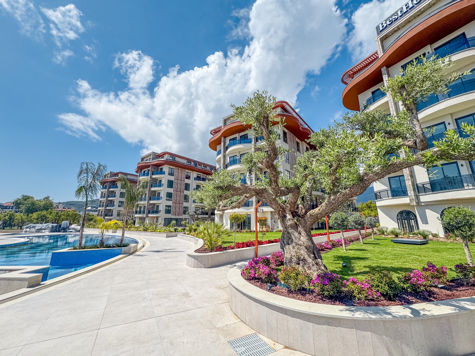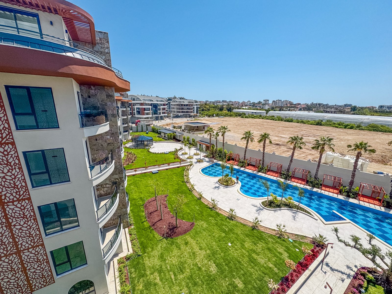 The apartment has a total living area of 115 m² and is positioned on the 4th floor with south-east exposure. It features pool, garden, and city views, providing bright and spacious living spaces throughout the day. The property is delivered with built-in white goods and includes two bathrooms, two WCs, and two balconies for maximum comfort.
